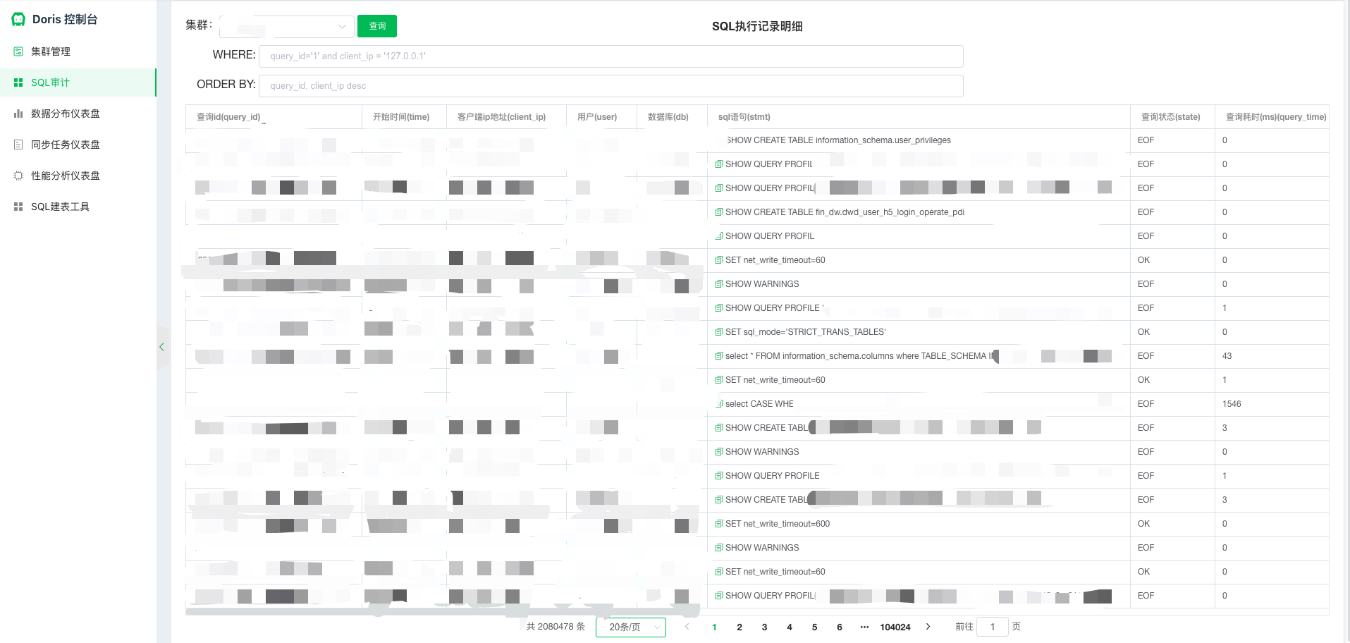 审计日志为集群 BE 崩溃时具体 SQL 定位、客户端访问统计、查询 SQL 耗时统计、访问 SQL 特征分析等提供了详细的信息。例如,数据开发曾经反馈查询 Doris SQL 失败,检索日志出现了大量连接数超限的异常,我们通过审计日志,迅速定位到了问题原因是由于上游导入工作流 Bug 在短时间内创建较多的数据库连接。另外,对于曾经使用的低版本 Doris 出现数次 BE 异常宕机问题,我们通过 gdb 调试工具定位到崩溃时 SQL 的 query_id 后,配合审计日志也能快速的定位到导致崩溃的具体 SQL。