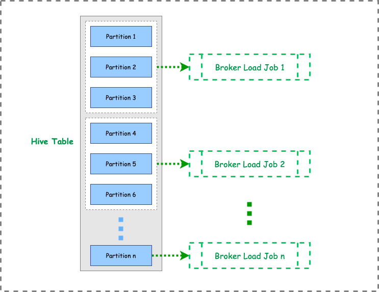 部分 pdi/pda 表数据规模在 T 级别,在进行全量导入时,如果只提交一个 Broker Load Job ,将因为导入任务的并发不够,导致导入耗时达到 5-6 小时。针对此问题,我们可以对导入任务进行 Job 拆分,在大数据平台也适配这种场景,支持任务的自动拆分和重试机制,具体的拆分方式如下图: