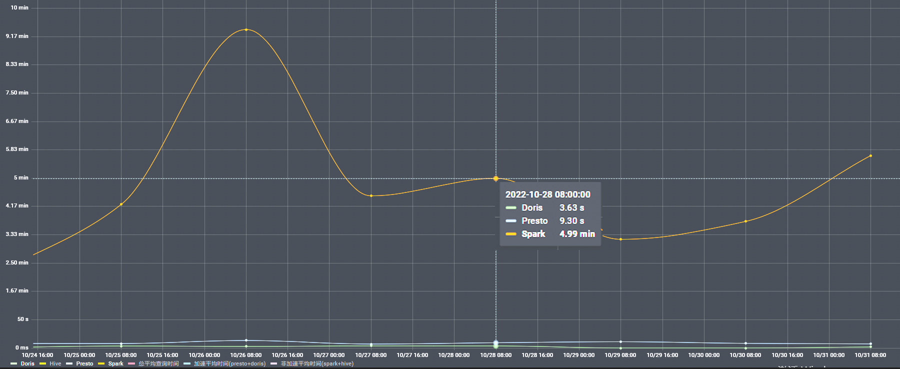 为提高查询性能,我们通过架设的 Doris 数仓加速层来缩短查询耗时,目前我们在不开启 Doris 缓存、不开启用物化视图等优化策略的情况下,命中 Doris 即席查询平均耗时即可从几分钟缩短至 5 秒内。