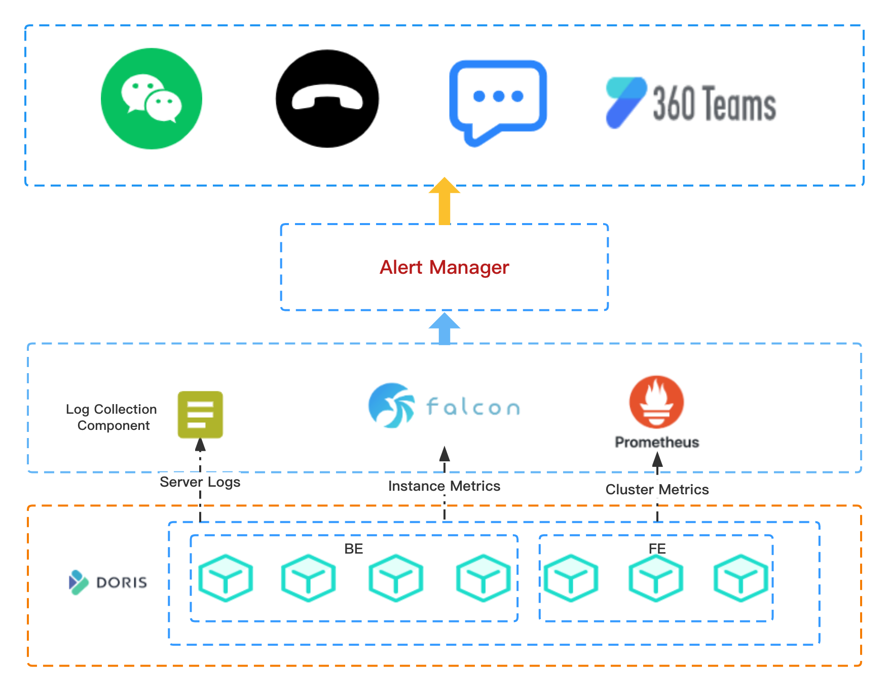 当前 Doris 集群监控体系分为主机指标监控告警、日志告警和集群指标监控告警,总体监控体系如下。