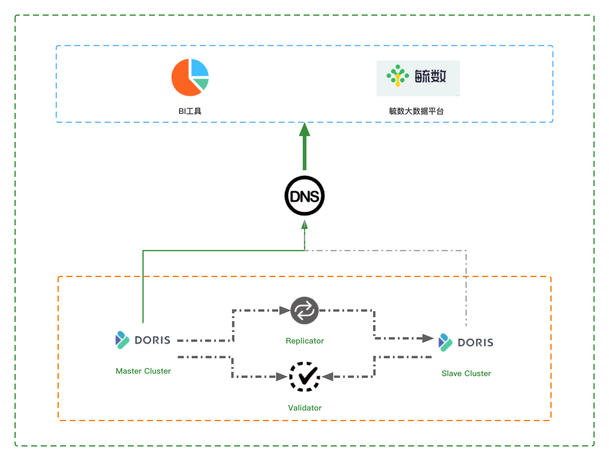 通过在主集群安装 Replicator 插件,Replicator 插件会拦截并解析主集群执行的全量 SQL,然后经过过滤操作,筛选涉及库、表结构变更和数据增、删、改相关的 SQL,并将相关 SQL(部分 SQL 需要改写)发送到备集群进行重放。除此之外,我们在 Doris 控制台开发了 Validator 数据校验程序,定期校验主备集群间的数据结构差异和数据差异并上报,在主集群因各种问题导致不可用时,直接通过切换 DNS 解析地址到备集群 LVS 地址完成主备集群的切换。