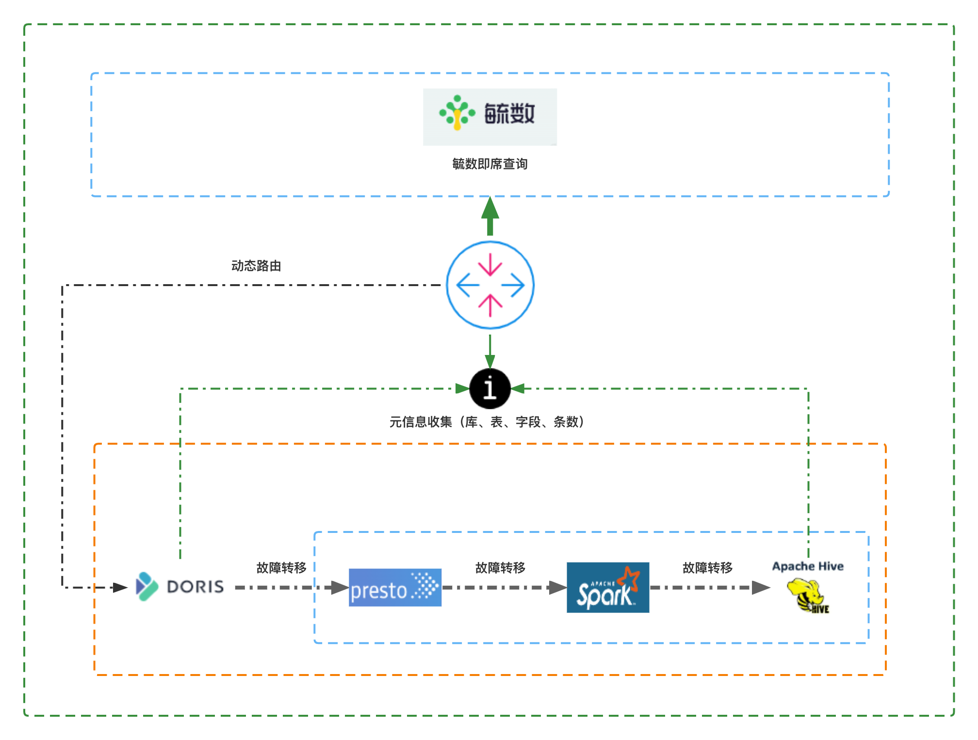 如果以上要求均被满足,则会将该查询路由到 Doris,否则会依次按照 Presto、Spark、Hive 的顺序进行路由查询,当查询出现异常时,也会按照该顺序依次进行故障转移。