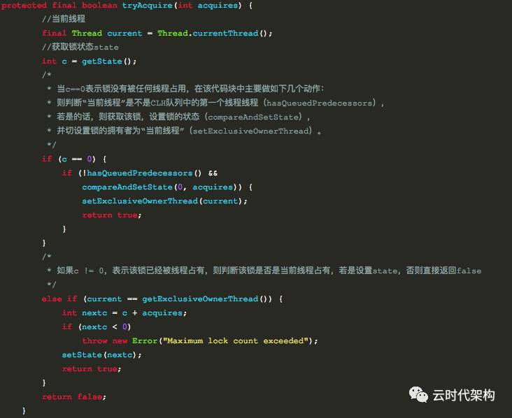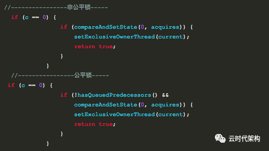 是否已经发现了不同之处。公平锁中要通过hasQueuedPredecessors()来判断该线程是否位于CLH队列中头部,是则获取锁;而非公平锁则不管你在哪个位置都直接获取锁。