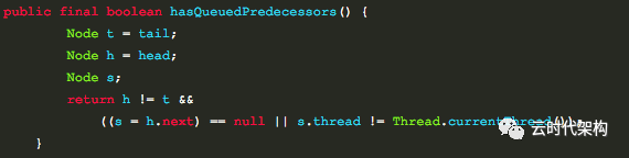 hasQueuedPredecessors:"当前线程"是不是在CLH队列的队首,来返回AQS中是不是有比“当前线程”等待更久的线程(公平锁)。