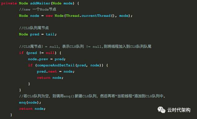 addWaiter的实现比较简单且实现功能明了:当前线程加入到CLH队列队尾。