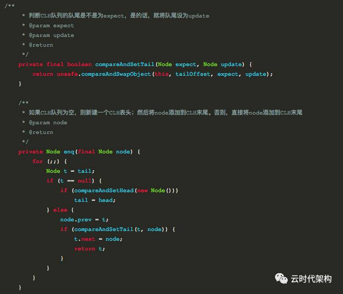addWaiter()主要是将当前线程加入到CLH队列队尾。其中compareAndSetTail和enq的源代码如下: