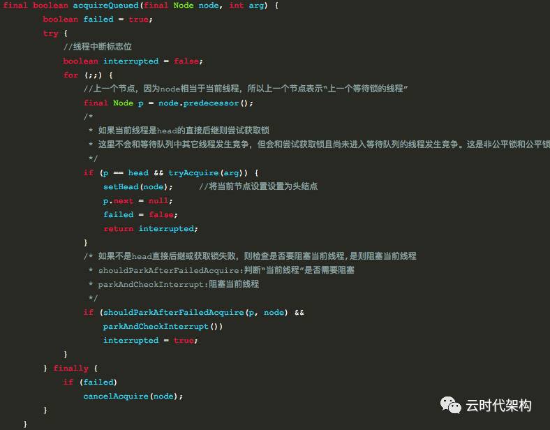 总之,如果“前继节点调用unpark()唤醒了当前线程”并且“前继节点是CLH表头”,此时就是满足p==head,也就是符合公平性原则的。否则,如果当前线程是因为“线程被中断”而唤醒,那么显然就不是公平了。这就是为什么说p==head就是保证公平性!