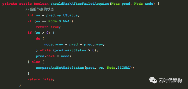 shouldParkAfterFailedAcquire:判断“当前线程”是否需要阻塞,源码如下: