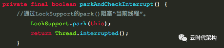 parkAndCheckInterrupt:阻塞当前线程,并且返回“线程被唤醒之后”的中断状态,源码如下: