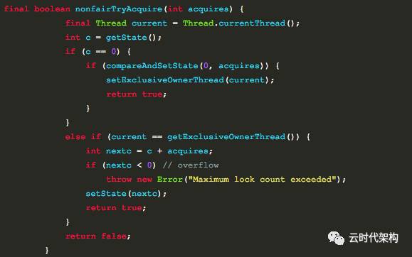 与公平锁相比,非公平锁的不同之处就体现在if(c==0)的条件代码块中: