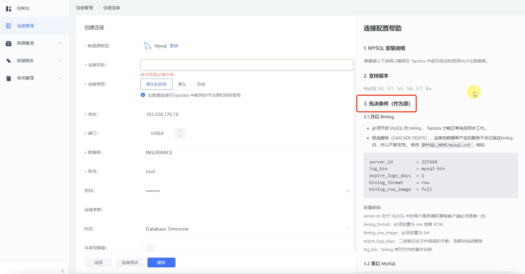 ① 创建连接:配置时要特别留意屏幕右侧的【连接配置帮助】,确保【先决条件】所列各项,均已在服务器上得到支持。