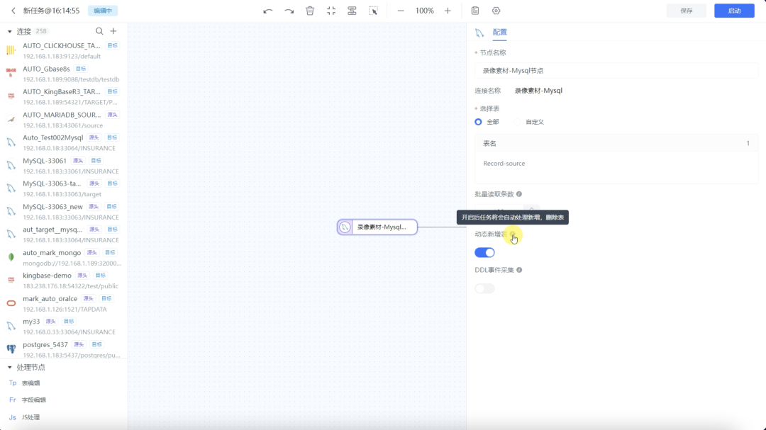 数据读取范围可选【全表】和【自定义】: 选择全表时,可手动开启【动态新增表】,任务将会自动处理新增、删除表。