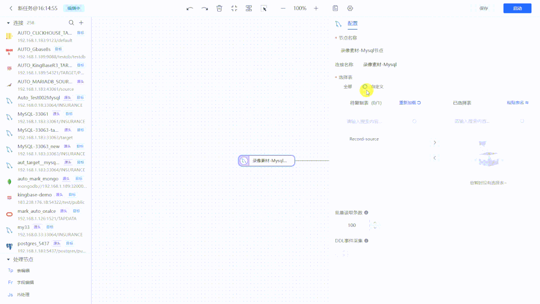 【批量读取】条数为全量同步时,可以根据服务器的压力和带宽设置每一次读取的数据条数。 【DDL 事件采集】开启后将会自动同步原表结构的变化,譬如新增修改字段、修改属性以及删除字段。