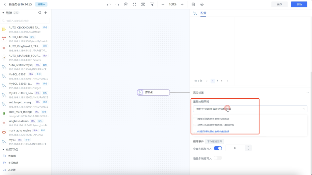 【重复处理策略】:当复制任务启动时,如果发现目标端已经存在相同表名的表时,是使用现有的表和数据还是删除重建