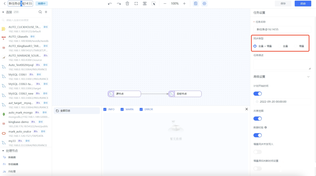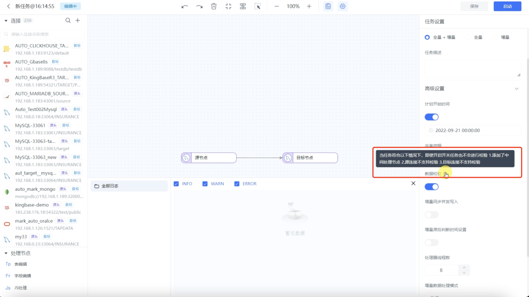 【共享挖掘】:若有多个任务需要从源库读取数据时,为降低源库压力,开启后会将增量日志存储到中间库中(*注意:只有任务和源链接都开通时才有效) 【数据校验】:开启后会对任务中所有的表数据进行校验,不一致时,可以在任务监控中查看。这里需要注意的是,当任务符合以下三种情况时,即使开启任务也不会进行校验:a) 添加了中间处理节点;b) 源连接不支持校验;c) 目标连接不支持校验