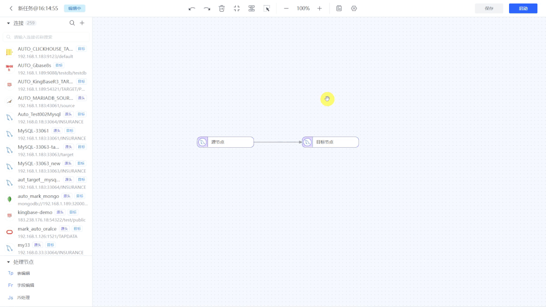 创建的任务都会被系统保存下来,处于【编辑中】状态。可以直接点击右上方的【启动】按钮进行配置检测和任务启动;也可以只点击【保存】按钮,只检测任务配置。如果可以启动,任务会被置为【待启动】状态。(*请注意定期清理编辑中的草稿任务)。