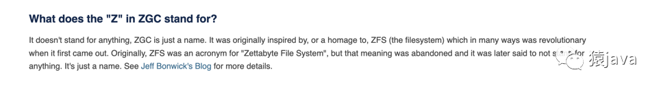 大概意思为:Z 它不代表任何东西,ZGC 只是一个名字。它最初受到 ZFS(文件系统)的启发或致敬,ZFS(文件系统)在首次问世时在许多方面都是革命性的。最初,ZFS 是“Zettabyte File System”的首字母缩写词,但这个意思被废弃了,后来据说它不代表任何东西。这只是一个名字。