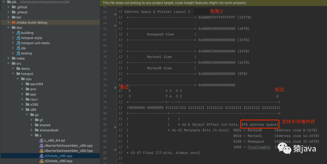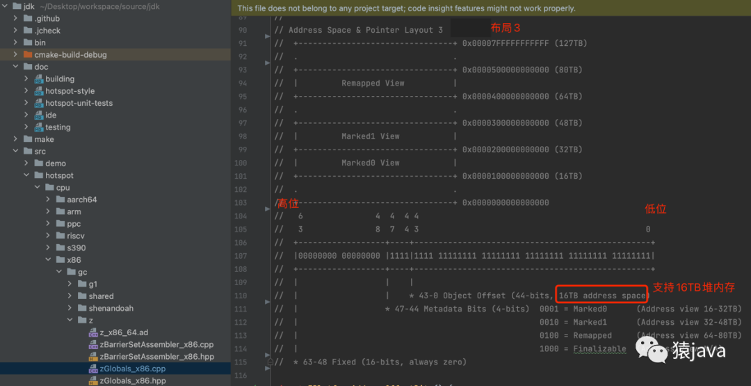 Colored pointers:染色指针,一种将数据存放在指针里的技术,JVM 是通过染色指针来标识某个对象是否需要被 GC。像 CMS,G1 这些垃圾收集器的 GC 信息都保存在对象头中,而 ZGC 的 GC 信息保存在指针中,每个对象有一个 64 位指针,参考 JDK zGlobals_x86.cpp 源码,ZGC 地址空间和指针结构有如下 3 种布局: