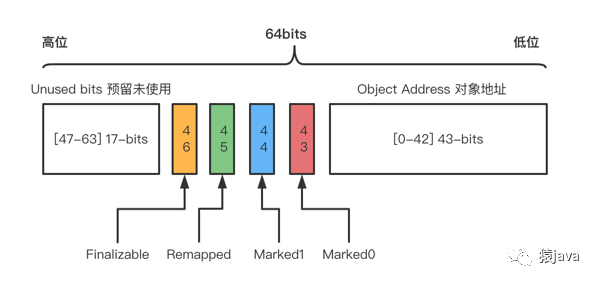 [43-46] 共 4-bits,对应 Metadata Bits,存放 Marked0,Marked1,Remapped,Finalizable 元数据;