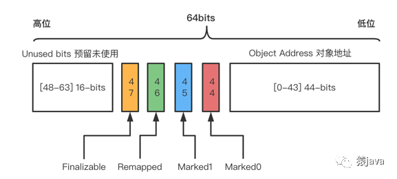通过上面的 3 种布局,可以发现一个共性:分配 4-bits 来分别存放 Marked0,Marked1,Remapped,Finalizable 染色标记位,4 种染色标记位说明如下: