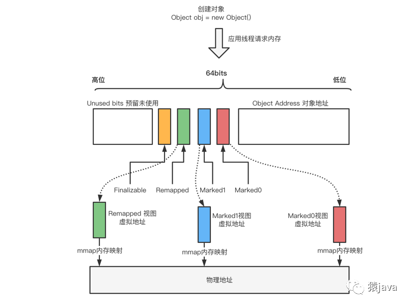上述 Marked0,Marked1,Remapped 染色标记位其实代表一种地址视图,当应用程序创建对象时,首先在堆空间申请一个虚拟地址,ZGC 同时会为该对象在 Marked0、Marked1 和 Remapped 地址空间分别申请一个虚拟地址,三个虚拟地址指向同一个物理地址,并且在同一时间,三个虚拟地址有且只有一个空间有效,整个视图映射关系如下图: