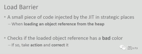 Load barriers:读屏障,是指 JIT( just-in-time compilation 即时编译器,JVM)向应用代码注入一小段代码,当从堆中读取对象引用时,就会执行这段代码,官方说明如下: