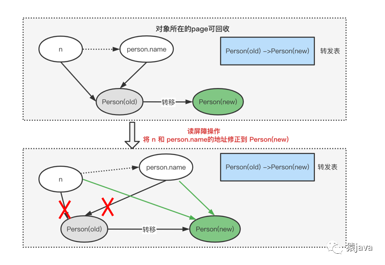 上图过程也称为"自愈",即当对象地址发生转移时,通过读屏障操作,不仅赋值的引用更改为最新值,自身引用也被修正了,整个过程看起来像自愈。