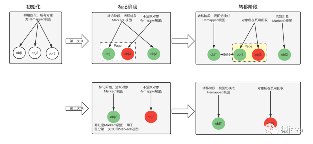 > 这里对"转移"做个解释:ZGC 是按照 Page 内存页进行垃圾回收的,也就是说当对象所在的页面需要回收时,页面里还存活的对象需要被转移到其他页。