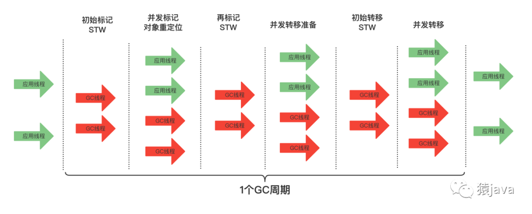 ZGC 垃圾回收全过程包含:初始标记、并发标记、再标记、并发转移准备、初始转移、并发转移 6 个阶段,如下图: