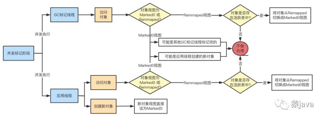 和 MCS、G1 等垃圾回收器一样,ZGC 也采用了标记-复制算法,不过,ZGC 对标记-复制算法做了很大的改进,ZGC 垃圾回收周期和视图切换可以抽象成下图: