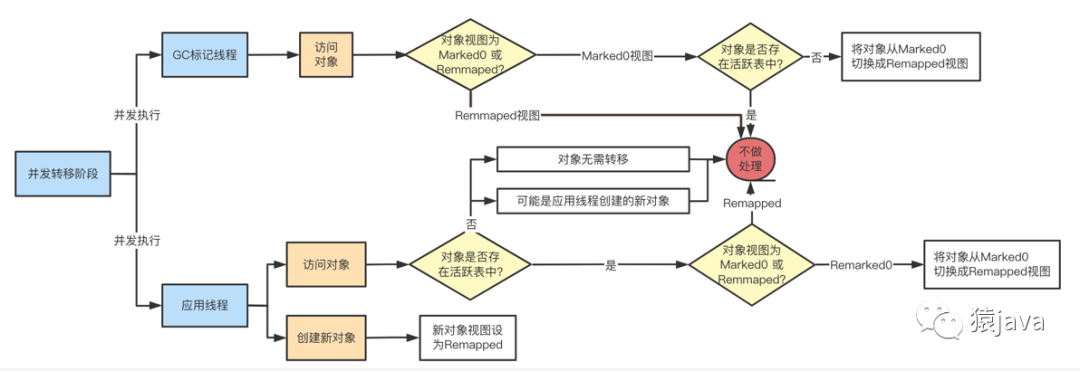 并发转移:这个阶段,GC 线程和应用线程是并发执行的,GC 线程和应用线程操作对象流程如下图: