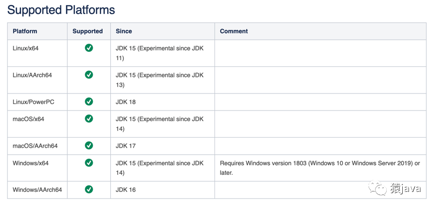 下面是官方文档列举的所有支持平台:目前,ZGC 目前支持了大多数的操作系统,并且是 64 位系统。