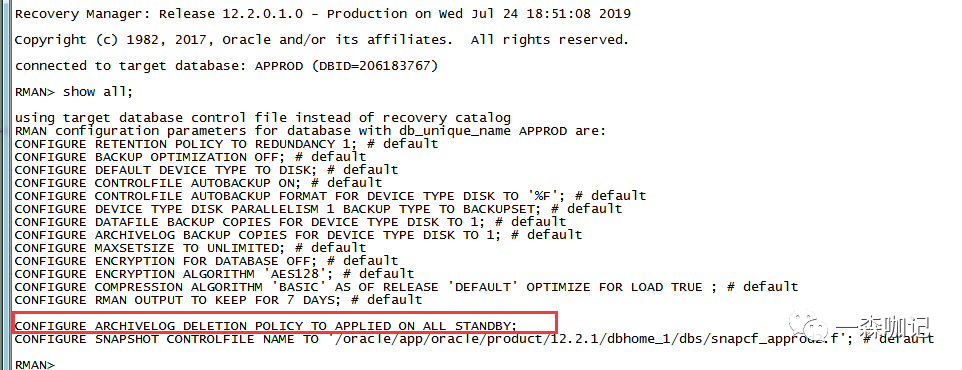 在主库rman环境下修改如下参数,作用是主库在数据库备份时,清理那些已经在所有standby库应用了的归档日志的主库所在的归档文件。