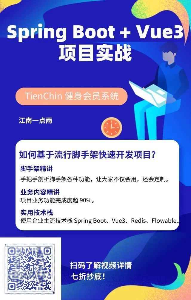 松哥最近正在录制 TienChin 项目视频~采用 Spring Boot+Vue3 技术栈,里边会涉及到各种好玩的技术,小伙伴们来和松哥一起做一个完成率超 90% 的项目,戳戳戳这里-->TienChin 项目配套视频来啦。