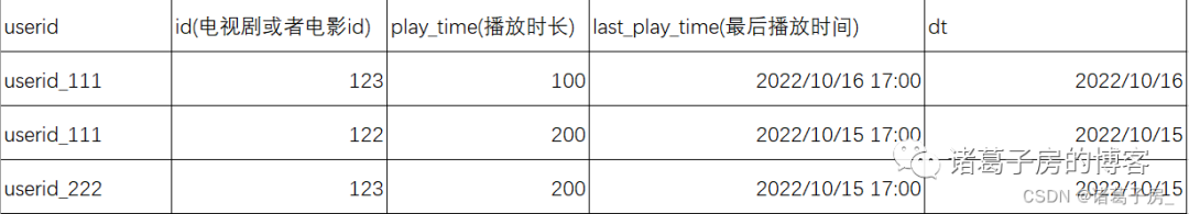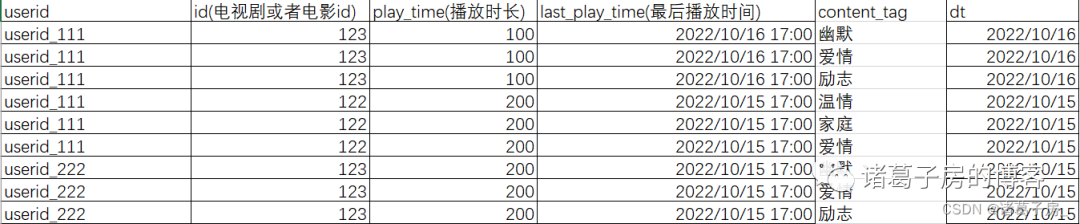 上面是一张播放行为表,涵盖了基本的播放行为数据,和一张为tag维度表(一个电视剧或者电影会打上非常多的标签,表中只是罗列了3个)