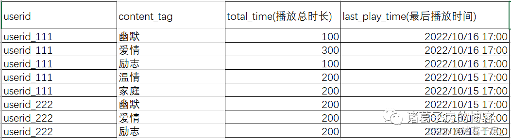 select userid,content_tag,sum(play_time) as total_time,max(last_play_time) as last_play_time from dws_user_play_info_tag group by userid,content_tag