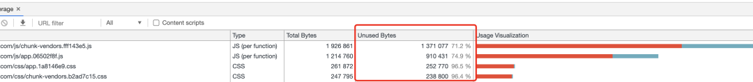 访问项目,利用 chrome 自带的 converge 工具,查看了下文件的使用率: