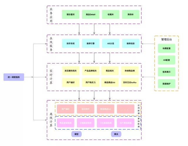 推荐系统的整体工程架构如下图,从下至上包括离线计算层、实时计算层、在线服务层,另外是后台配置管理系统和数据调度服务。