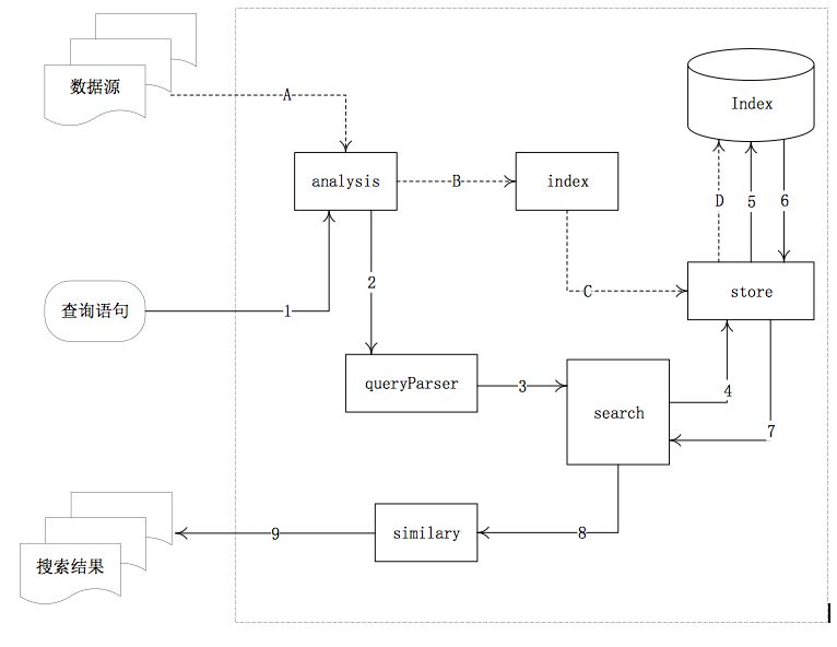 其中,虚线箭头(a、b、c、d)表示写索引的主要过程,实线箭头(1-9)表示查询的主要过程。