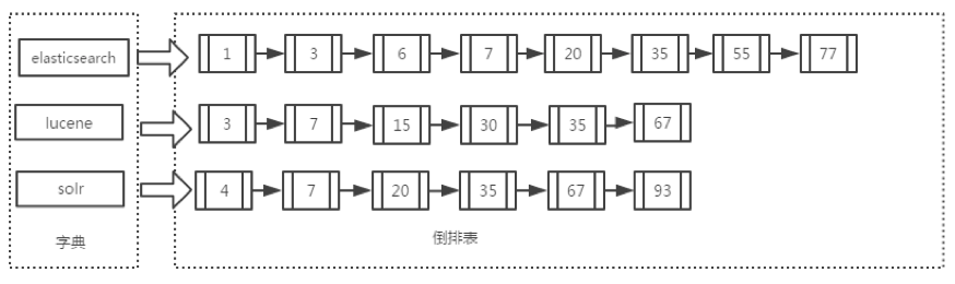 在倒排表中,“lucene”指向有序链表3,7,15,30,35,67,表示字符串“lucene”在文档编号为3、7、15、30、35、67的文章中出现过,elasticsearch和solr同理。