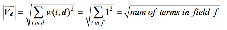 在Lucene的空间向量模型的实现类DefaultSimilarity中,认为在计算文档的向量模长时,每个Term的权重就不需要在考虑了,即w(ti,d)=1,只考虑Term在文档的几个Field中出现。