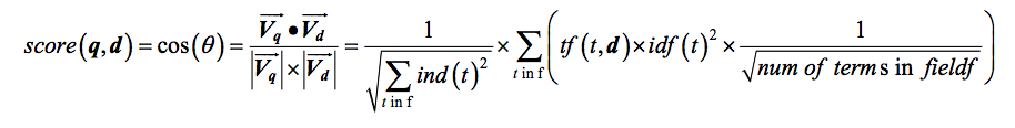 Vq﹒Vd=tf(t1, q)×idf(t1,q)×tf(t1, d)×idf(t1,d) + …… + tf(tn ,q)×idf(tn,q)×tf(tn, d) ×idf(tn, d)
