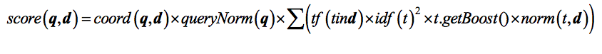 coord(q,d) =hitTermNum/queryTermNum。hitTermNum是文档d中包含查询词的个数。queryTermNum是查询语句中包含的Term的个数。比如在文档“elastic is a good project”中检索“lucene elastic”,因为匹配了elastic,没有匹配lucene,所以hitTermNum=1,queryTermNum=2,coord(q,d)=1/2。