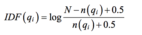 其中Wi的值是一个词的idf值,公式如下,这个公式是由BIM模型推理得出的: