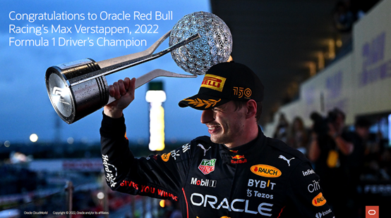 此次维斯塔潘提前成功卫冕F1年度车手总冠军,与甲骨文云基础设施OCI强大的后台支持是密不可分的,在研发下一代强劲引擎、培训车手以及根据不同场景决定比赛战略决策等方面,OCI全方位助力红牛车队,让车队得以提前夺得了第5个年度一级方程式世界车队总冠军殊荣!