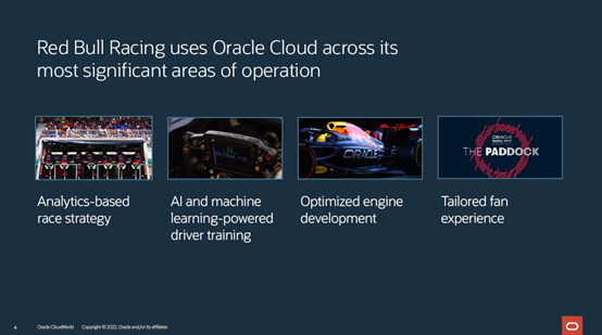 现今,红牛车队已在赛车上安装了大量的传感器,并在重要的运营领域使用甲骨文云进一步完善其比赛策略、车手训练、引擎开发及粉丝互动体验。