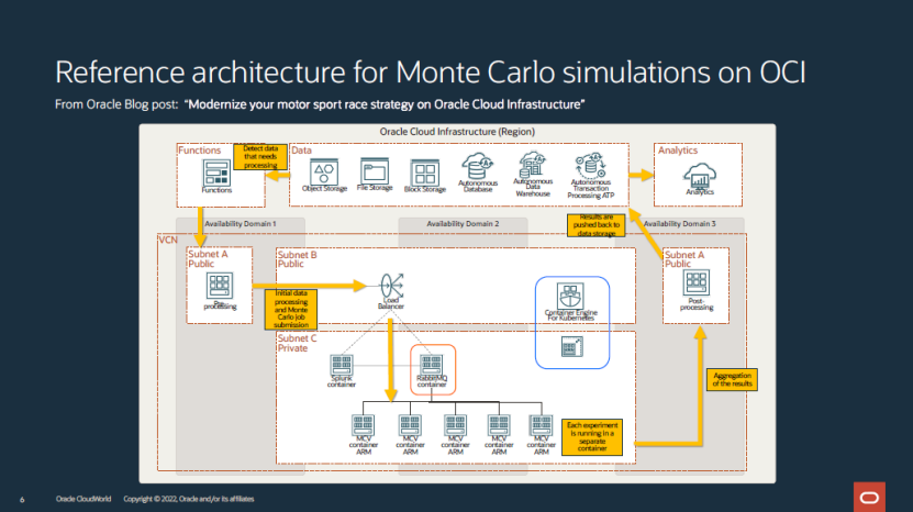 工程师面临的最大挑战是不确定性。比如雨天的几率有多大?其中一辆车会撞车吗?它需要维修吗?撞车发生在哪一圈?为了应对这些概率,工程师们正在使用OCI上运行的蒙特卡洛(Monte Carlo)方法来模拟数百万甚至数十亿次的比赛,从而为关键的实时比赛决策提供信息。由于 OCI 的低成本和高性能,红牛车队策略工程师能够多运行 25% 的模拟。同时,车队能够使用Oracle Container Engine for Kubernetes(OKE)将其模拟应用程序容器化,然后在基于OCI ARM的服务器上高效运行。而灵活的虚拟机 (VM) 则允许车队根据自己的需求自由调整 CPU 内存比率,使其尽可能经济且高效。