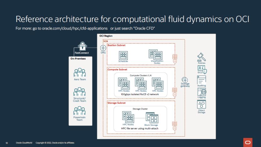 红牛车队利用Ansys仿真解决方案进行计算流体动力学(CFD)、材料数据管理和虚拟冲击测试,能更好地了解赛车周围飞速变化的气流,然后利用这些数据进行整体设计改进并提高空气动力学性能,确保最终车队的获胜。在OCI上搭建CFD系统参考架构如下图所示: