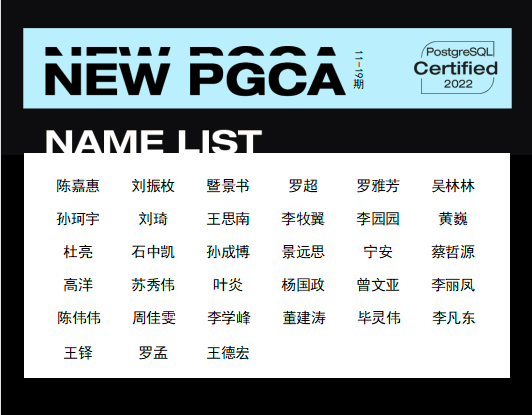 中国PostgreSQL培训认证委员会于11月19日组织进行了全国PostgreSQL初/中/高级认证考试。经过成绩汇总和统计,共有81位考生考取PGCA(初级)认证,69位考生考取PGCE(中级)认证,18位考生考取PGCM(高级)认证,现将本次考试通过名单予以公布。这些考生将获得由中国PostgreSQL分会颁发的《中国PostgreSQL认证考试技术能力证书》和工信部下属中国电子工业标准化技术协会颁发的《中国电子信息行业专业技术认定证书》两份证书。