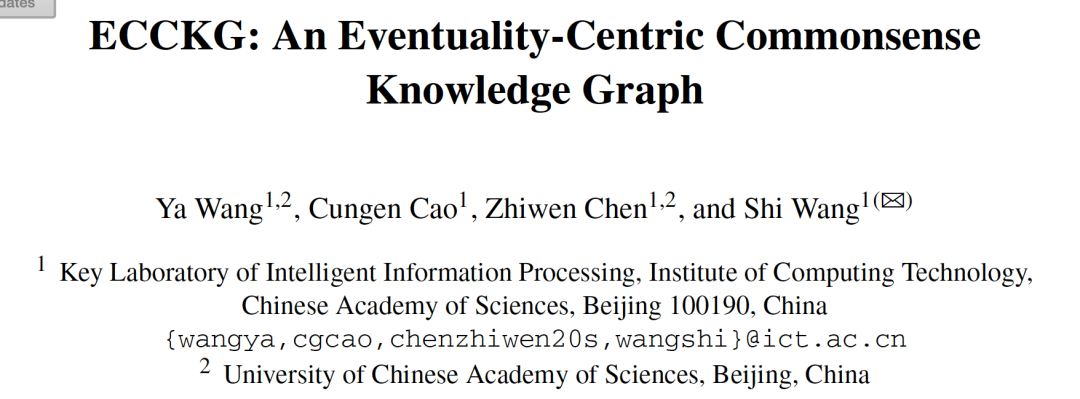 本周推荐的是一个大规模的以事件为中心的常识知识图谱ECCKG,相关文章ECCKG: An Eventuality-Centric Commonsense Knowledge Graph发表于KSEM 2022,作者来自中国科学院。